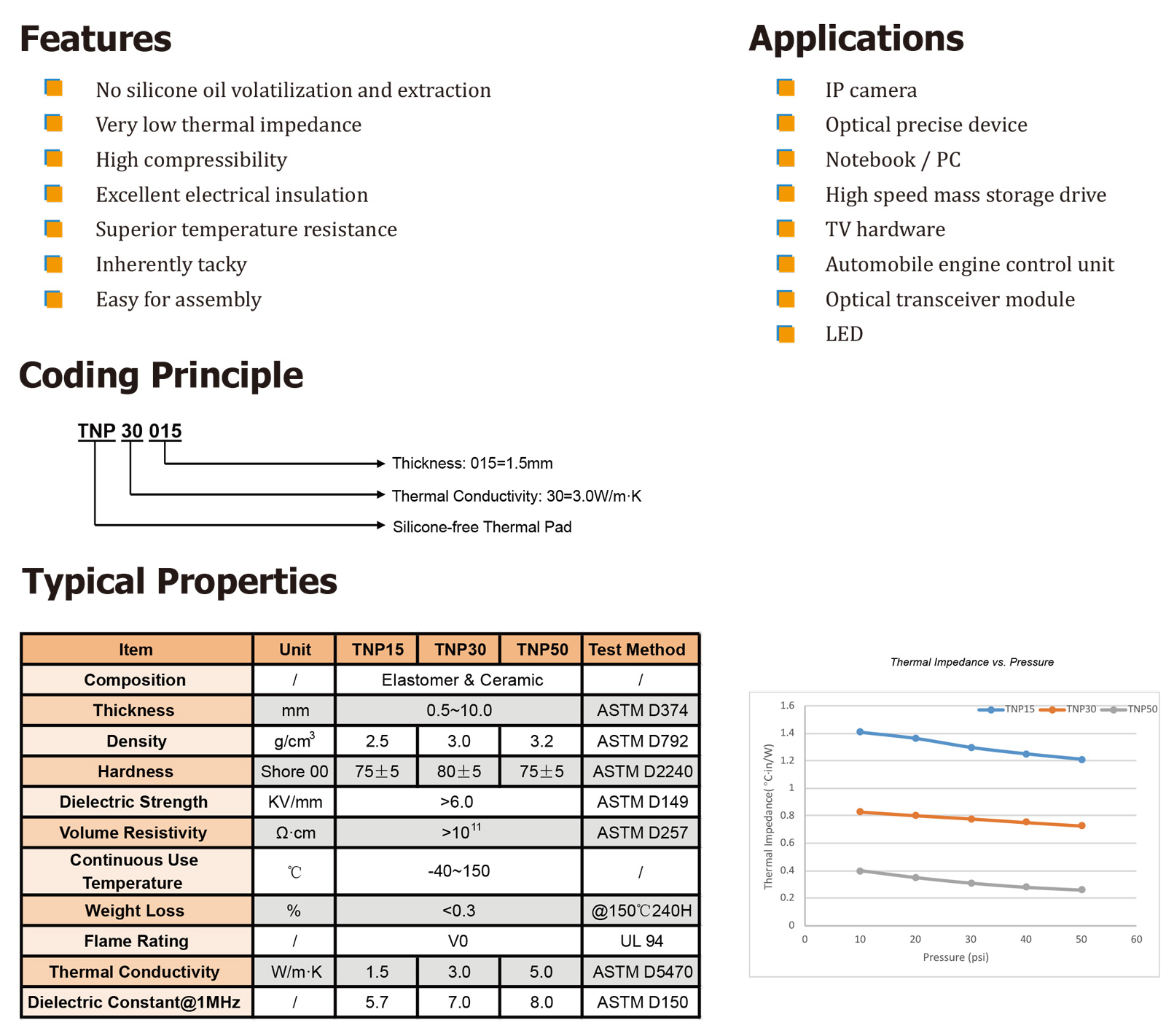 TM TNP系列是具有超高導(dǎo)熱性的無硅導(dǎo)熱墊,為填充硅油敏感電子元件和散熱器之間的氣隙提供了熱解決方案。它具有高壓縮性、粘性表面、柔軟性和靈活性。此款導(dǎo)熱墊可以防止硅油對電子元件的污染。" />
