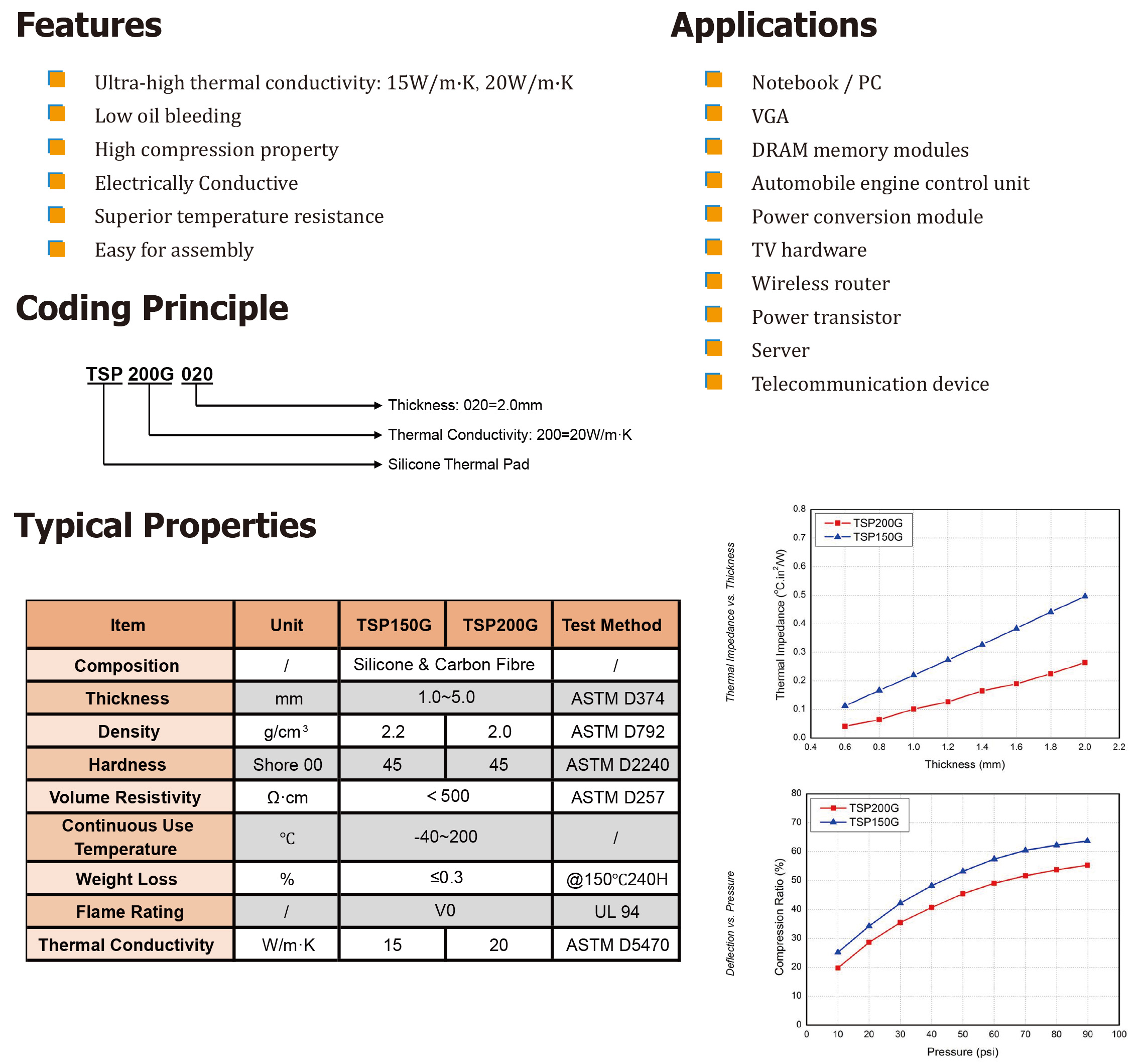 TM TSP-G硅基導(dǎo)熱墊采用高密度碳纖維填充聚合物基體,具有超高的導(dǎo)熱系數(shù),分別為15W/m·K和20W/m·K。還具有高壓縮性、柔軟性和靈活性。" />